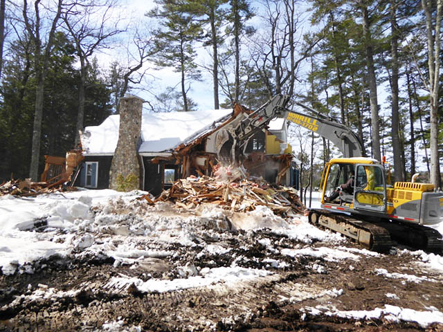The home that was located on the property could not be salvaged as it was dated and covered with asbestos siding and had a rubble, not poured, foundation. After a mile-long driveway was cut into the property for access, the home was razed to make way for the new construction. Below are images of the house prior to demolition and of the demolition process underway.